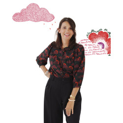 Celestial – Clusters of scattered dots form clouds bearing the promise “no rain no flowers”, while red blooms emerge from the darkness. Rain carries within it the birth of wonder.
