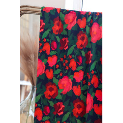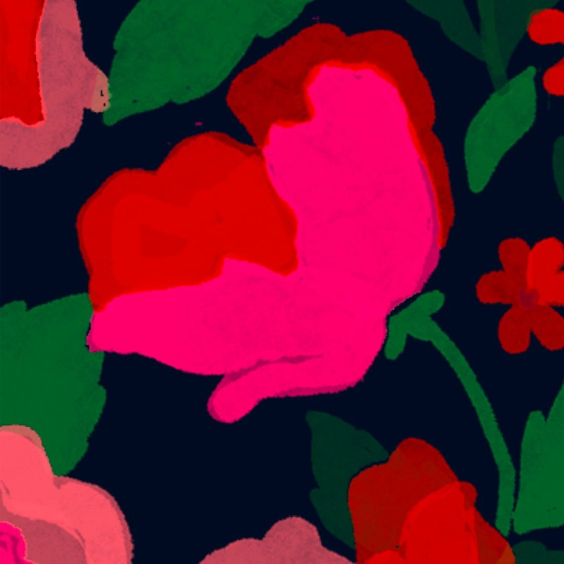 La Roseraie – Bold XXL flowers in vibrant shades of fuchsia and red bloom against a deep midnight background like a lush garden born from the rain, where every drop gives rise to colour.