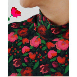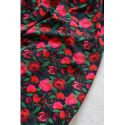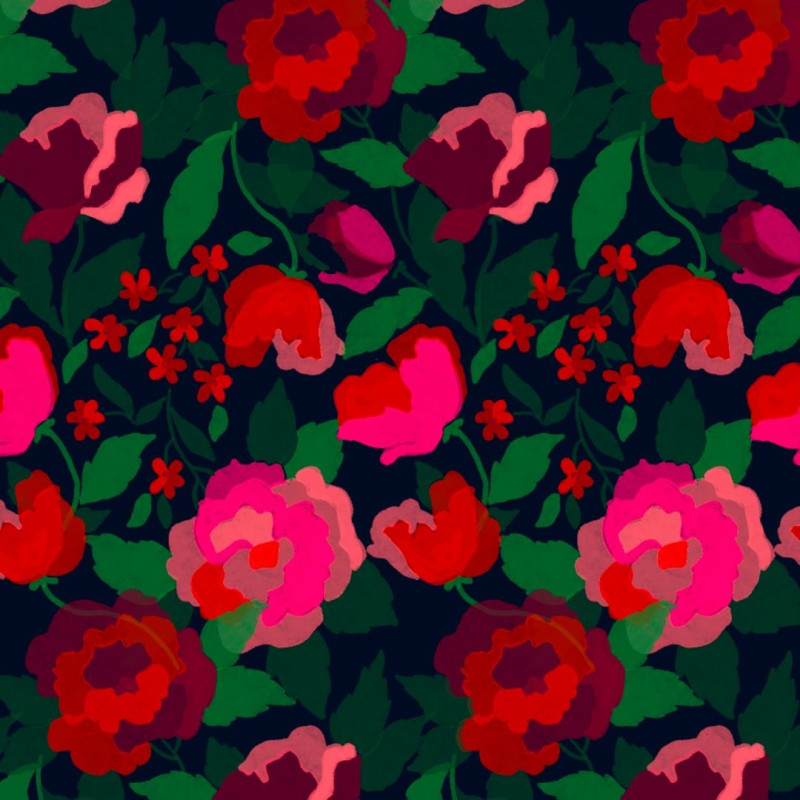 La Roseraie – Flowers in shades of red and fuchsia intertwine on a midnight background, in a smaller, tighter pattern designed to enhance the fluidity of a soft, flowing jersey.